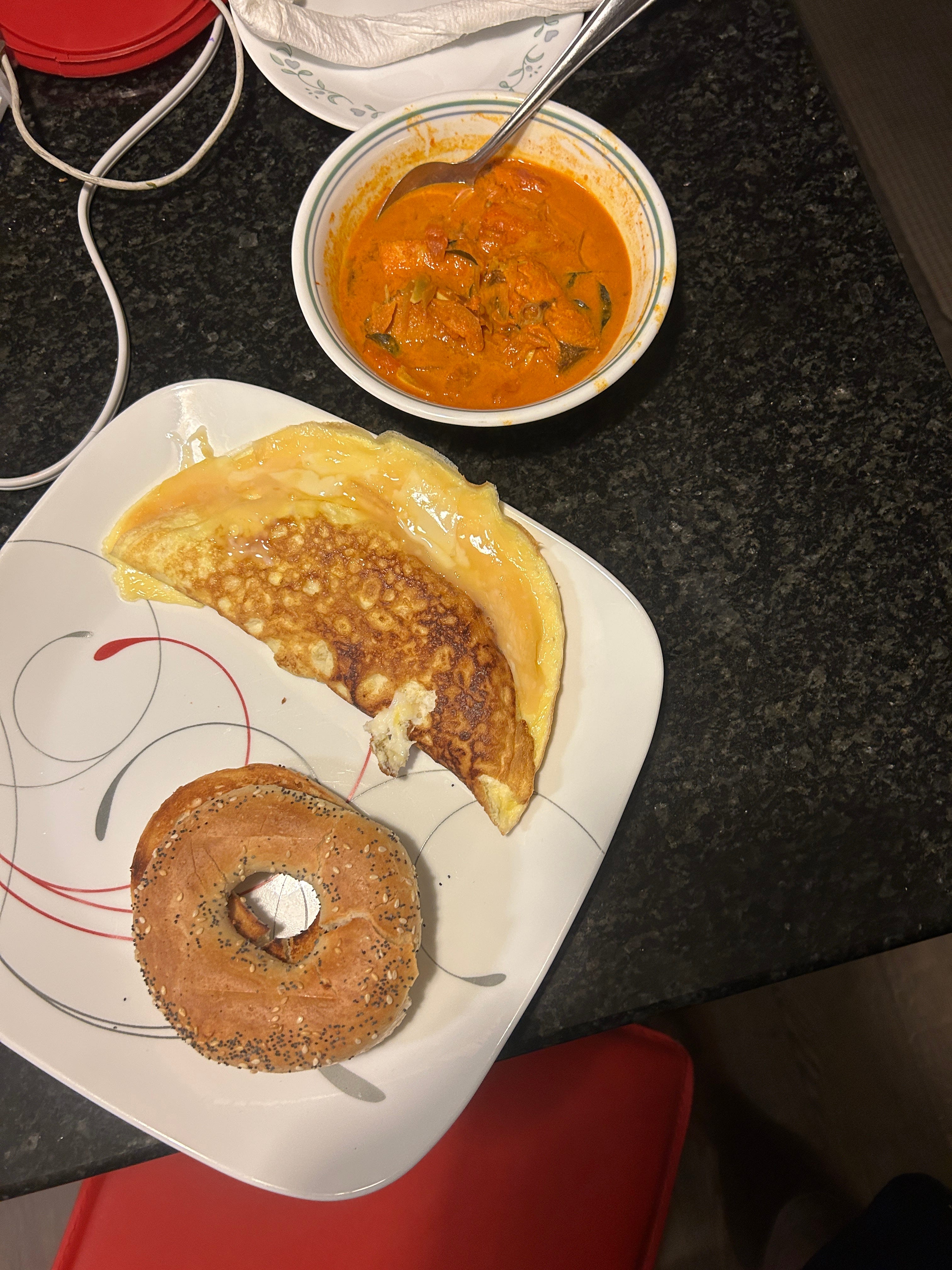 Photo of a bagel, an omelette and fish curry. I thought it was really funny because it’s like fusion of all cultures. I’m literally eating a bagel with fish curry